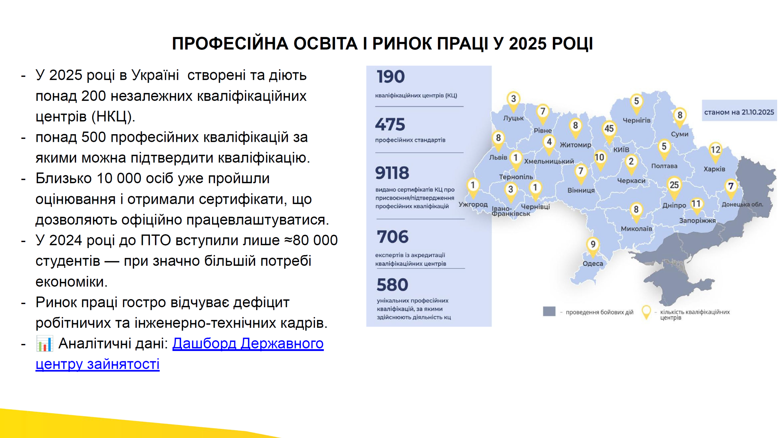 - Поряд із класичними ліцеями й закладами профосвіти з’являються незалежні центри оцінювання та підтвердження кваліфікацій – вони дозволяють людині показати реальні вміння, а не лише диплом.